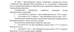 Ограничение посещения образовательного учреждения: Для учащихся 1-4 классов - при температуре воздуха -25 градусов и ниже Для учащихся 10-11 классов - при температуре воздуха -ниже -28 градусов