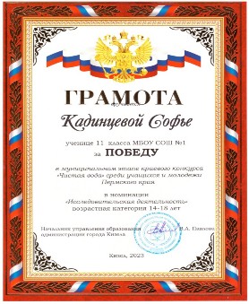 лучшую исследовательскую работу «Возможность применения воды из природных источников, расположенных на территории городского округа «Город Кизел» в качестве питьевой» представила Кадинцева Софья, ученица 11А класса, (руководитель Тартынских Анна Борисовна). Вода на нашей планете играет огромную роль. Вода - источник жизни, главный компонент всех организмов и ни одно живое существо не может прожить без воды. Мы рады, что наши ребята ценят этот подарок природы.